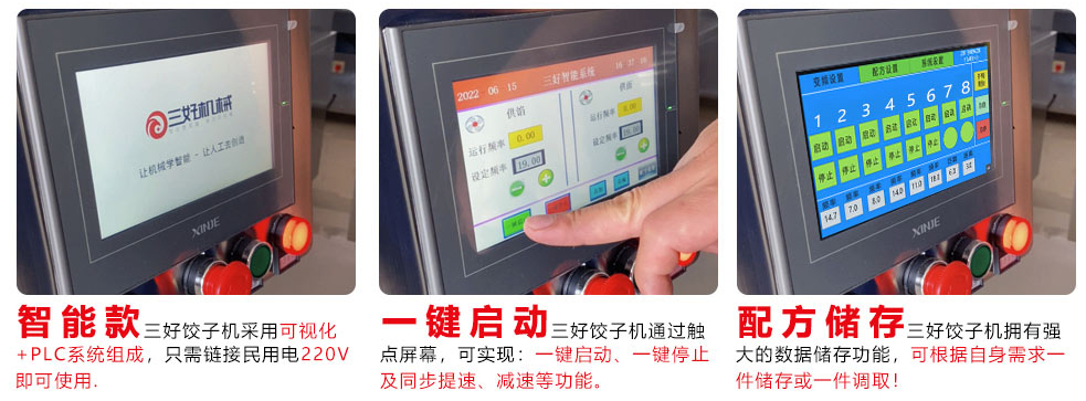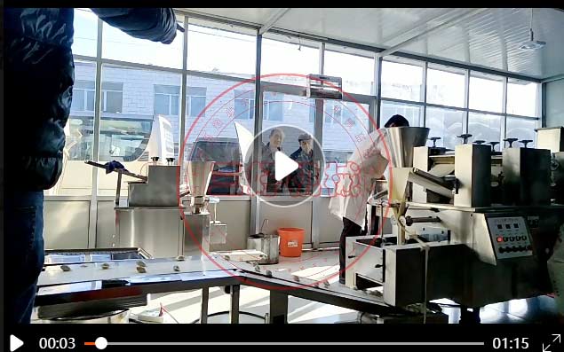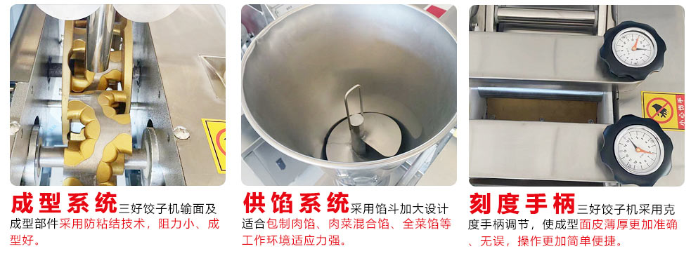 制作好面坯和拌好的餡料放入機器的餡斗和面斗,通過刻度手柄可以調節皮的厚薄,微電腦數控系統調節餡料多少,將面和餡傳送至成型機頭即可出餃子